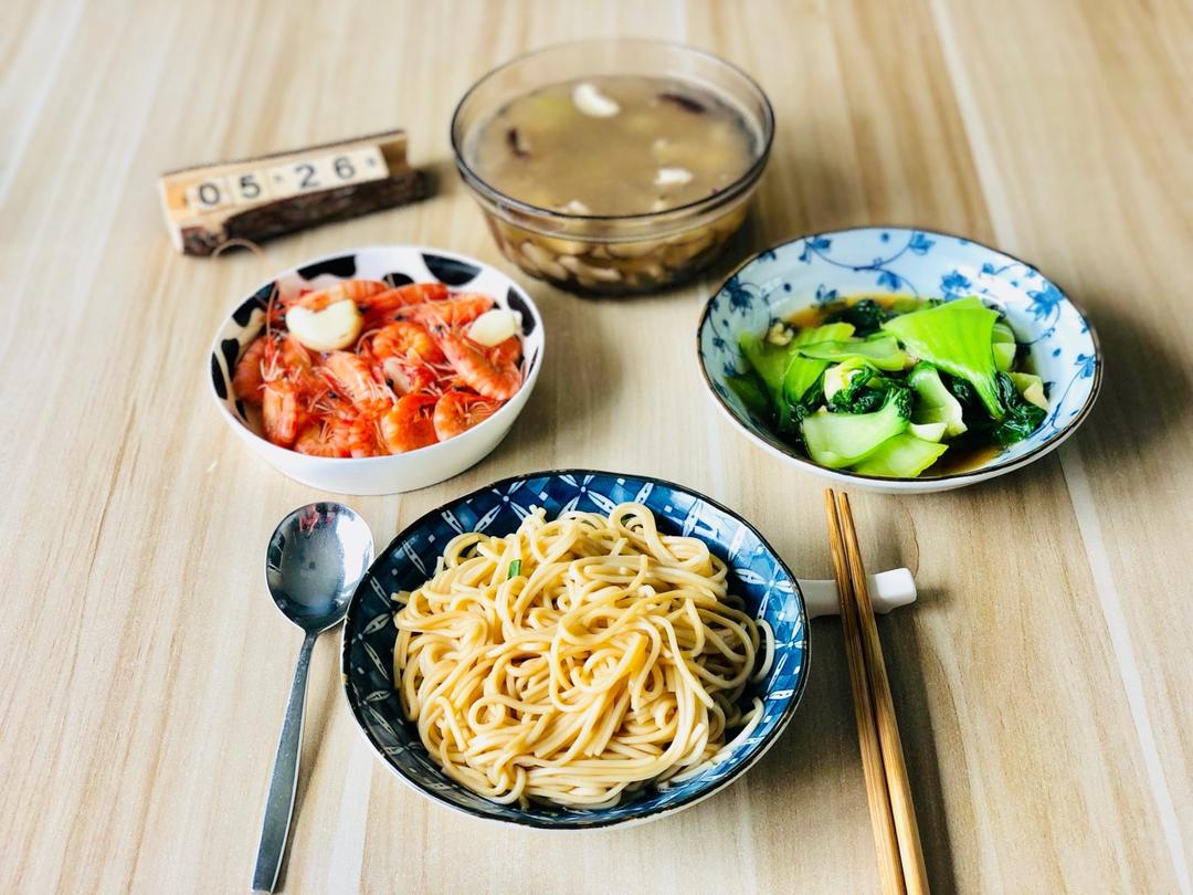 葱油拌面➕白灼🦐➕蚝油青菜➕香菇肉片汤