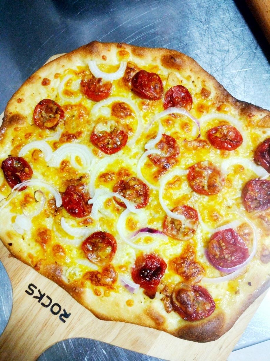 用这个油渍小番茄烤了个薄底披萨,挺好吃的。