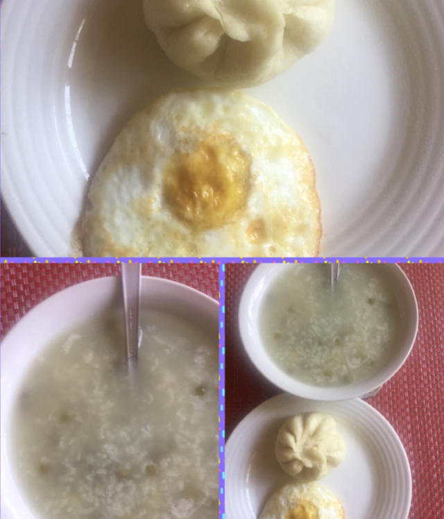 绿豆粥降降火、味道很好。一碗绿豆粥+一个自己包的包子+一个荷包蛋开始美好的一天。