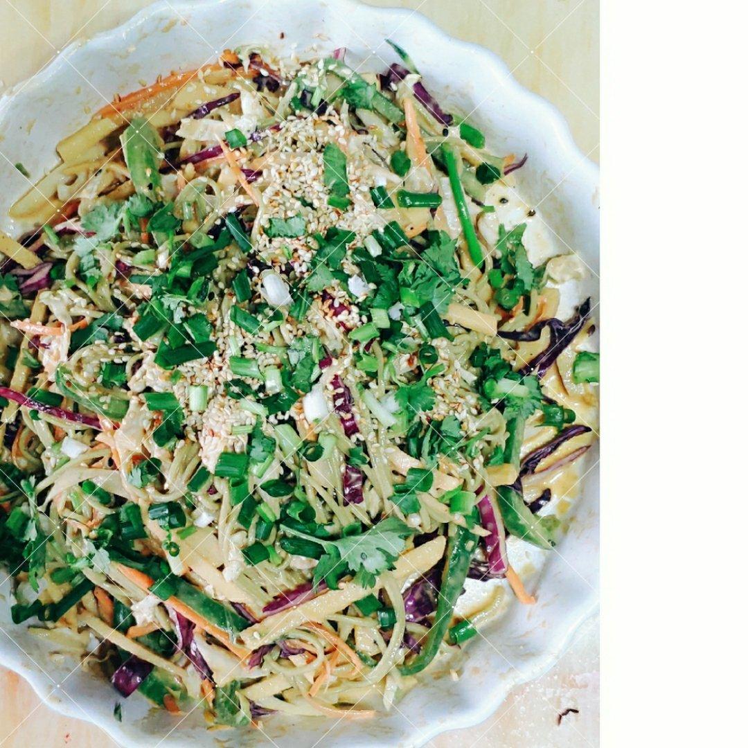 正好家里头抹茶荞麦面条,天气略闷热就做了这个拌面。配菜有啥放啥,做中饭很爽口!