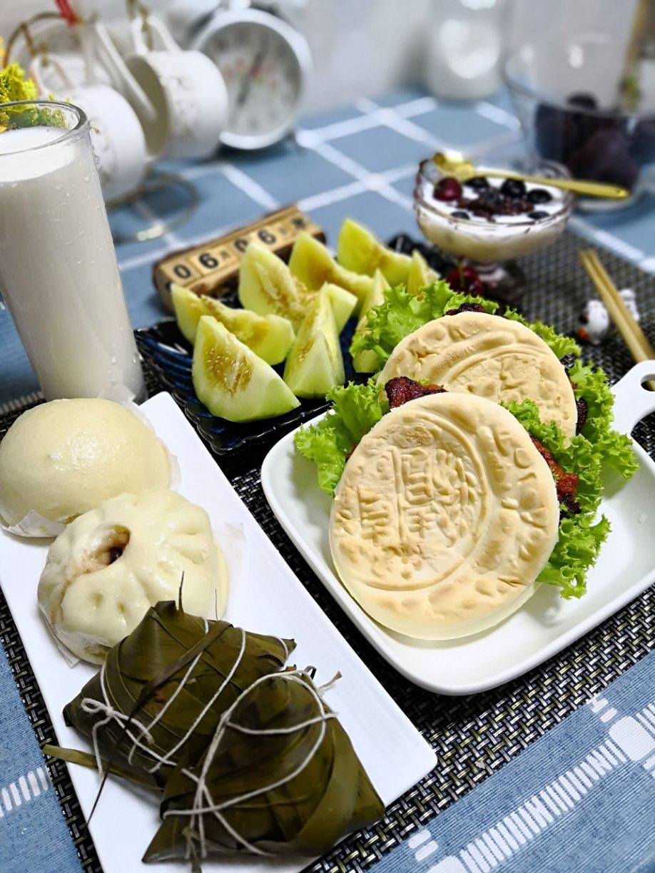 #早餐•2019年6月6日# 今天早餐:奥尔良鸡肉夹馍,奶黄包粽子,蜜豆酸奶杯,甜瓜,牛奶,鸡蛋。