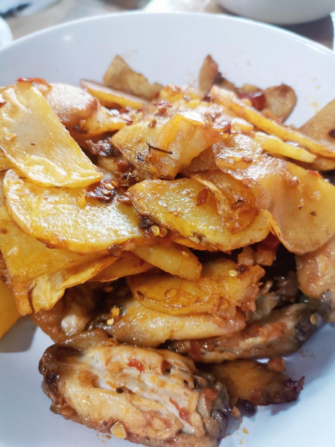 第N年第N次做这个菜。先用空气炸锅炸熟鸡翅和土豆,下锅加各种辣酱一炒,解决问题