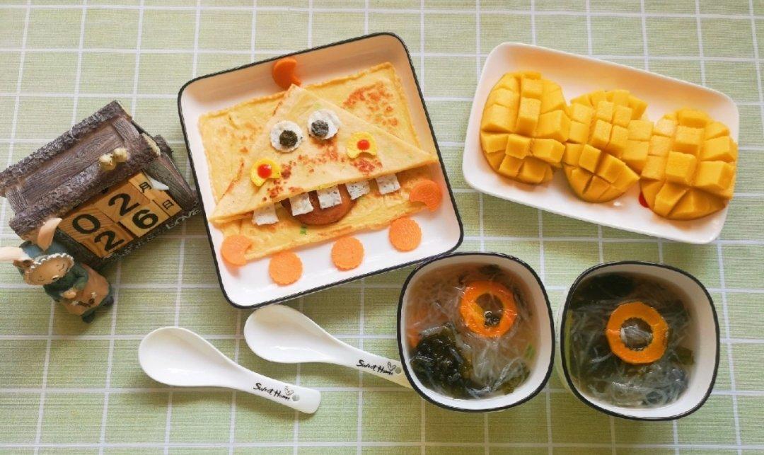 丑妖精不坏 做过 会吐舌头的大牙怪三明治 #早餐•2019年6月26日# 今日美食:大嘴怪鸡蛋饼(鸡蛋,普通面粉,葱花),萝卜丝紫菜汤,芒果花😘让生活充满童趣,让生命充满力量,早安(^O^)!家里没买吐司和火腿,只好利用现有食材了,太喜欢原版的感觉,下次争取学的更完美,感谢(❁´ω`❁)! 2019-06-26