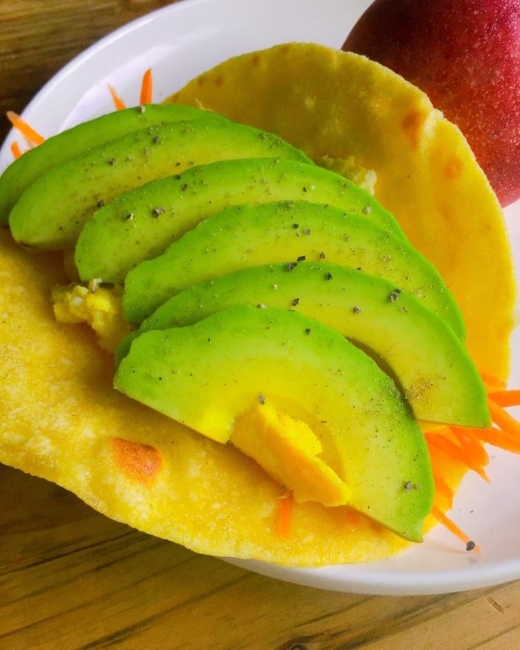 玉米饼夹胡萝卜丝➕炒鸡蛋➕牛油果