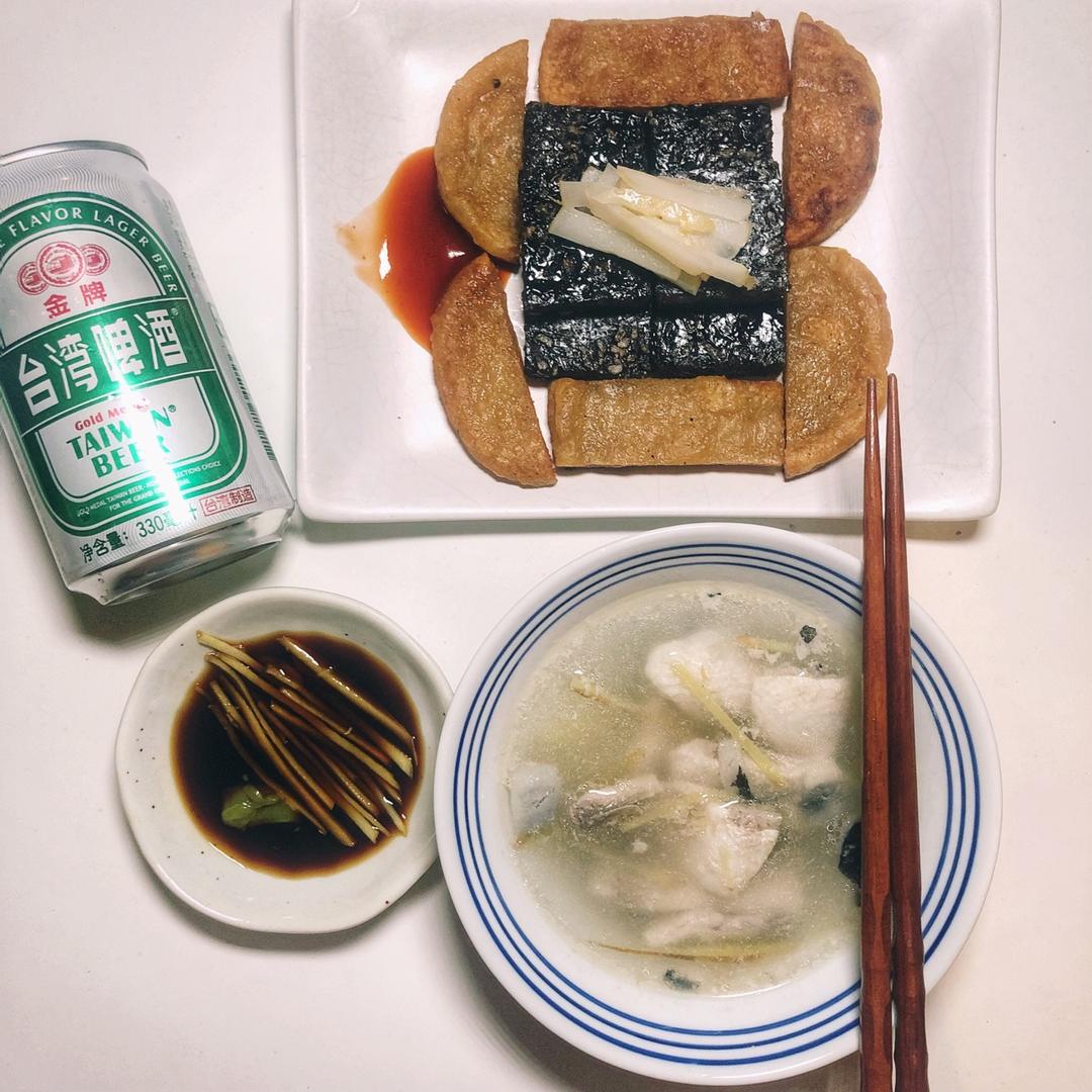 克莱因蓝-1 做过 晚餐•2019年7月4日 #晚餐•2019年7月4日#其实是前天的晚餐补上来~好不容易买到的虱目鱼肚到货了,鱼肚汤赶紧煮起来,配上大量的姜丝,鲜!另外还一起买了米血和甜不辣,也顺便煎几块。一顿彻底的湾湾风晚餐~想念#用食物表达我对你的爱# 2019-07-04