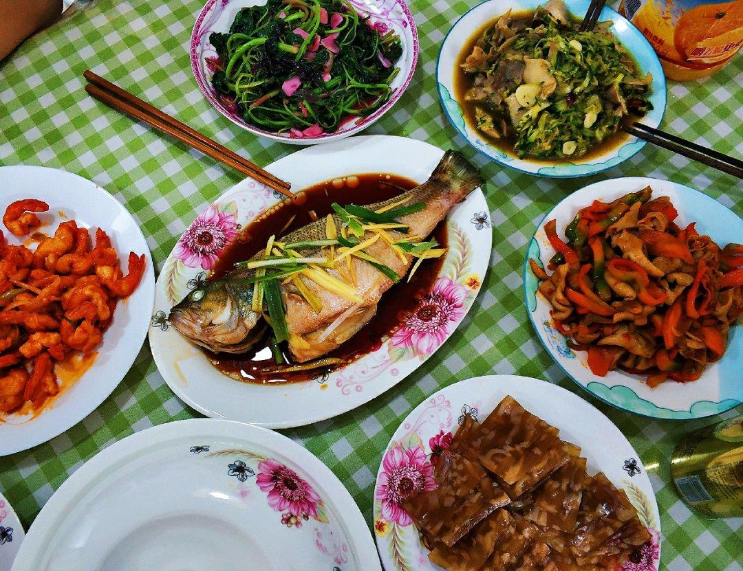 我们朋友的厨艺也是相当了得,每个菜都灰常灰常好吃,清蒸鲈鱼鲜嫩甜美,回锅肥肠q弹下饭,番茄虾仁酸甜可口,还有肉皮冻,黄瓜拌肚丝,蒜蓉红苋菜,最精彩的是小炒香干盖浇面,真是喷香顺滑,美味诱人