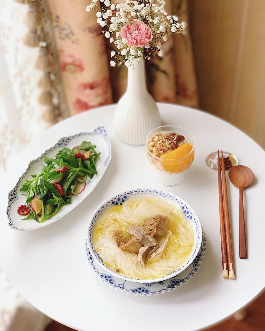 #早餐•2019年7月21日#猴头菇鸡汤面、黄桃酸奶杯、冰草油浸小番茄沙拉。