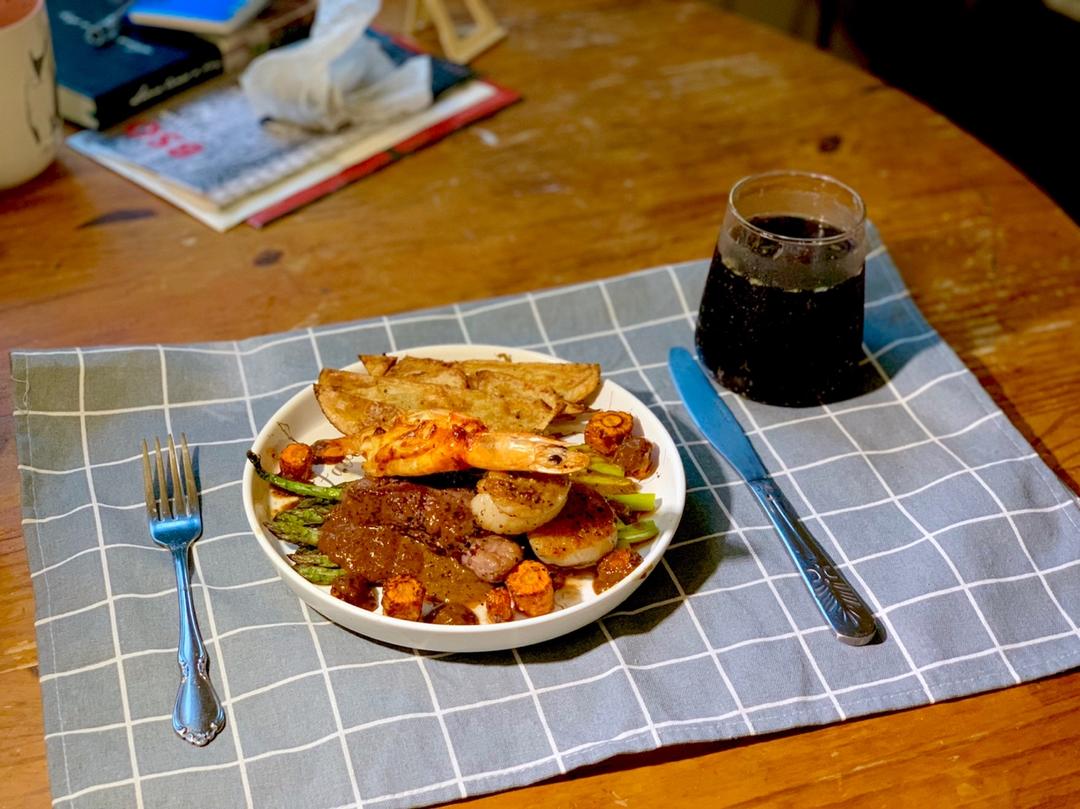 家里还剩一块牛排,于是撸了一份海陆大餐。摆盘苦手啊XD试了好几种摆盘方式都不是特别满意,最后不能再等了再等就凉了于是开吃了~