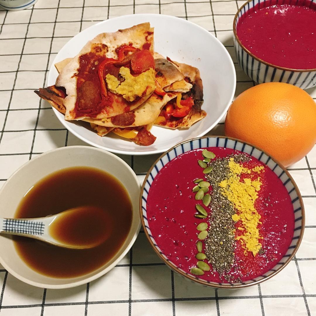扶阳膏,蔬果昔,自制素披萨,西柚