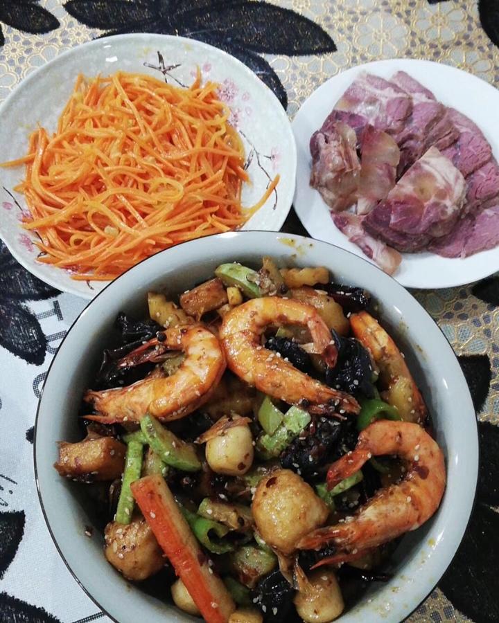 吃完火锅剩下鱼丸、蟹棒、木耳、鹌鹑蛋、西葫芦、虾🦐……加了土豆、尖椒