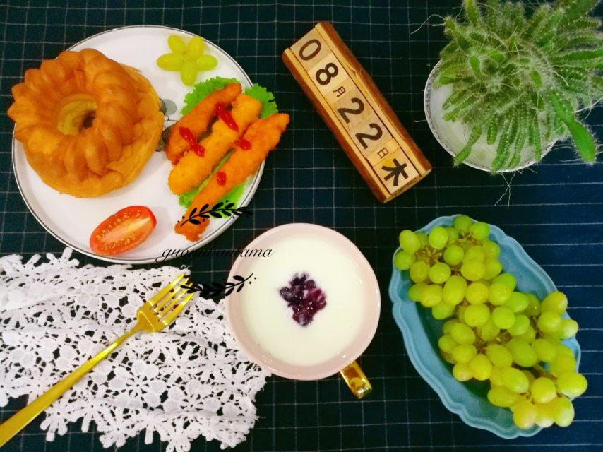 [太阳][太阳][太阳]早上好[太阳][太阳][太阳]戚风蛋糕,炸鸡柳,葡萄,蓝莓酸奶。