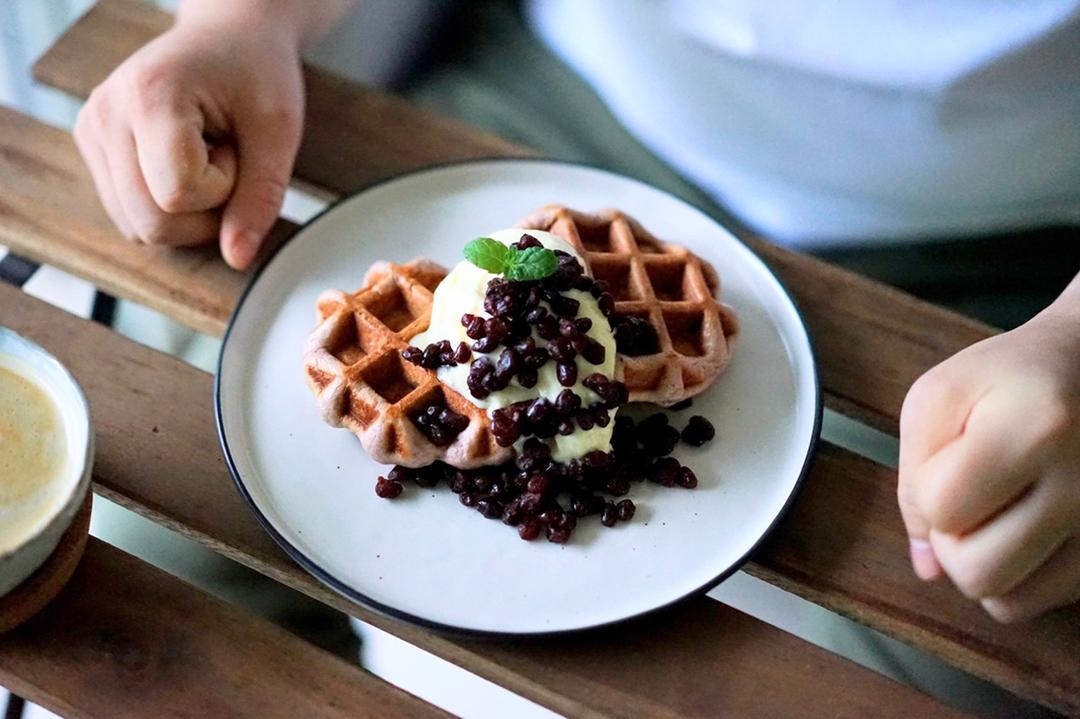 做了紫薯红豆奶油华夫,再来一杯热美式,大叔表示很满意。