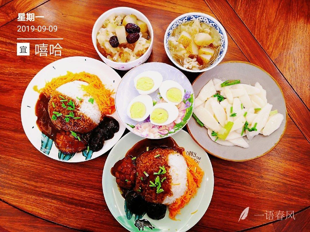 周一早餐 : 鲍鱼捞饭&冰糖雪梨银耳汤&素炒山药&资深笨鸡蛋