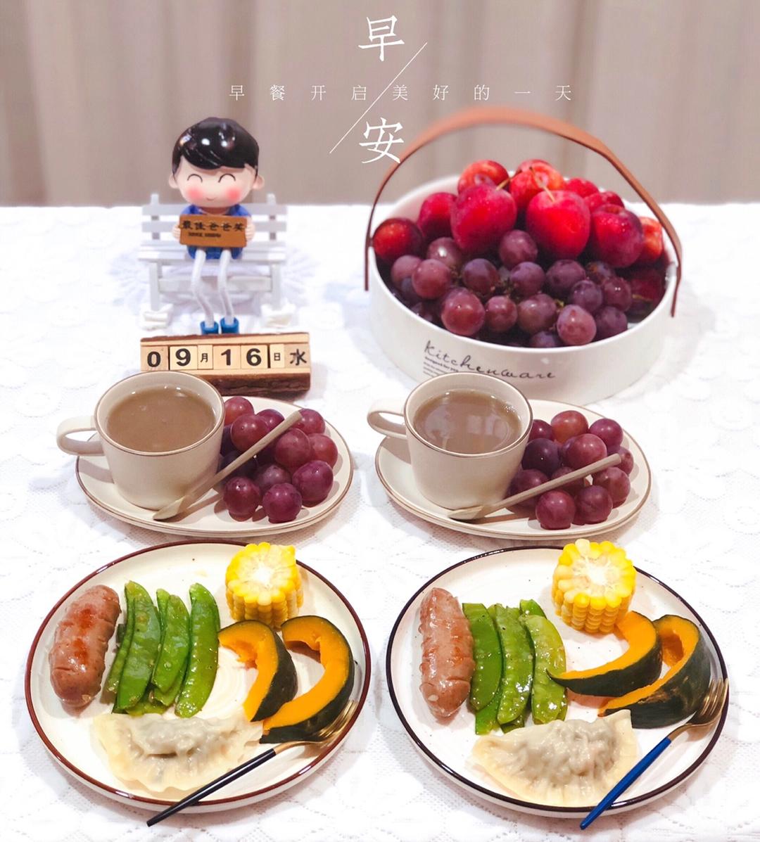 足迹a 做过 早餐•2019年9月16日 #早餐•2019年9月16日#永远不要放弃对美好生活的追求,以简单美好的生活完善复杂的人生。今日早餐百合绿豆汤+蒸玉米南瓜饺子热狗+荷兰豆+葡萄新周早🌞🌹 2019-09-16