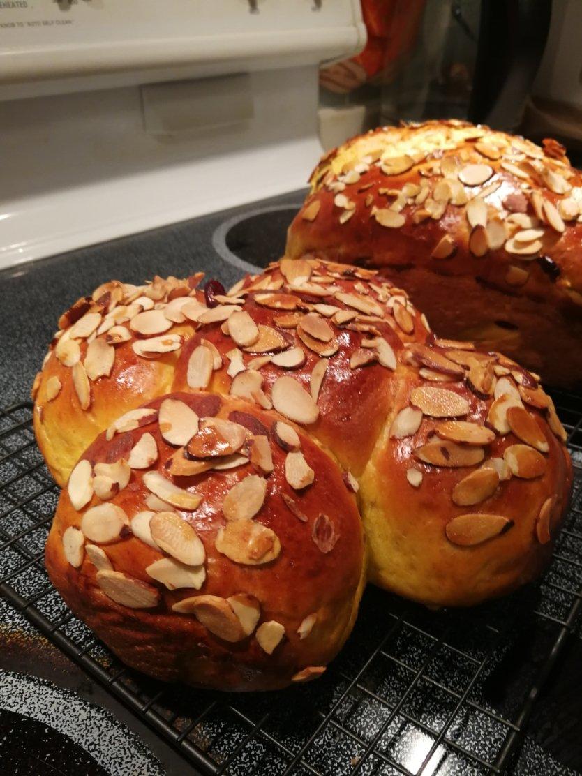长条的里面加了蔓越莓,十字的没有。外面刷一层蛋液➕杏仁片,满屋子飘香啊!今晚怎么睡得着呢?!不能宵夜了啊!回国已肿了快十斤了!