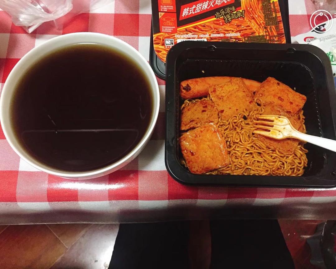 来大姨妈时想吃辣的 左边红糖水 右边火鸡面 国产的辣度好很多了