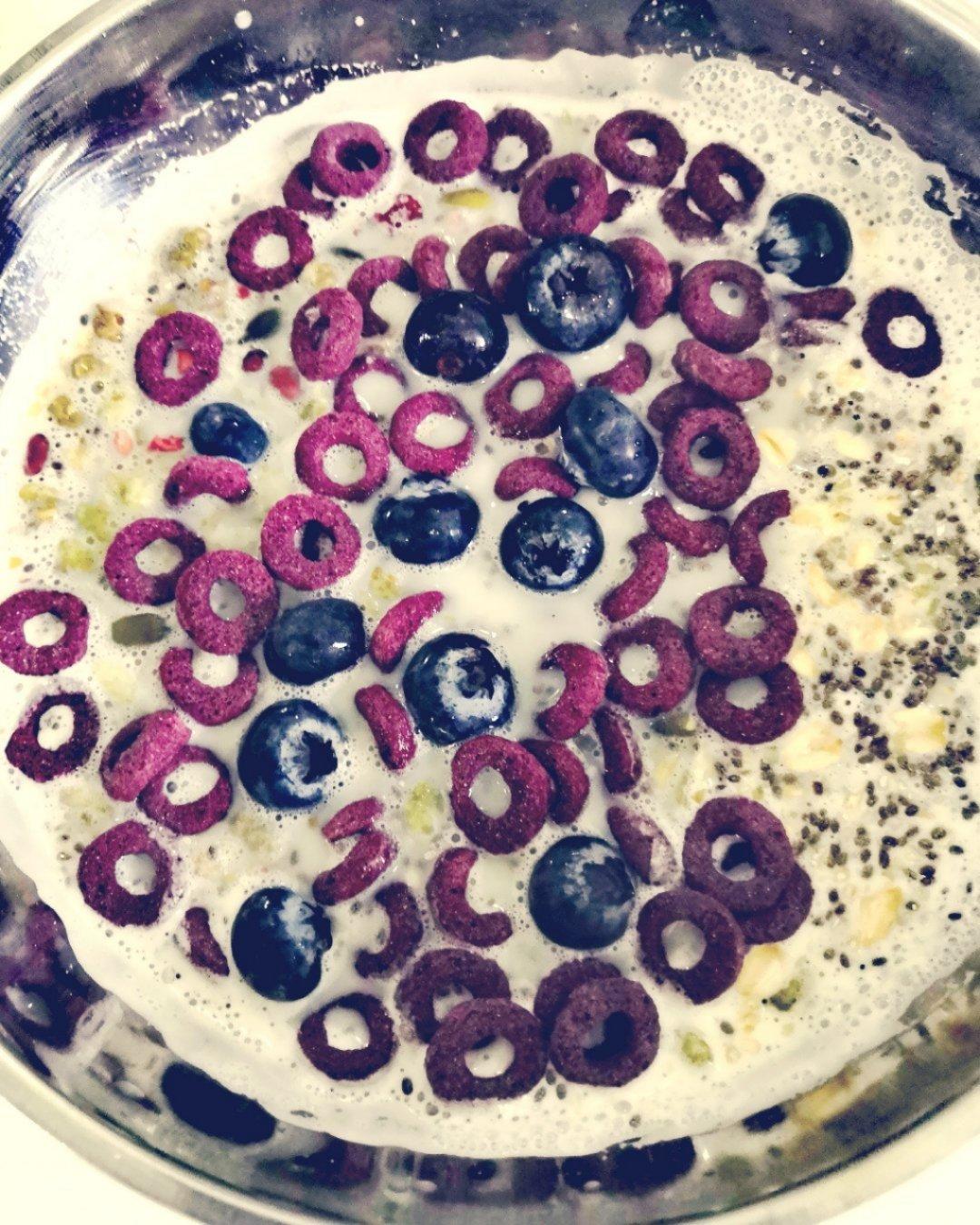 维他椰子味豆奶(可以加热)+抹茶红豆麦片(Easy Fun) + 奇亚籽燕麦片(Easy Fun) + 即食燕麦片(Nature First)+ 山药紫薯圈(Easy Fun) + 蓝莓