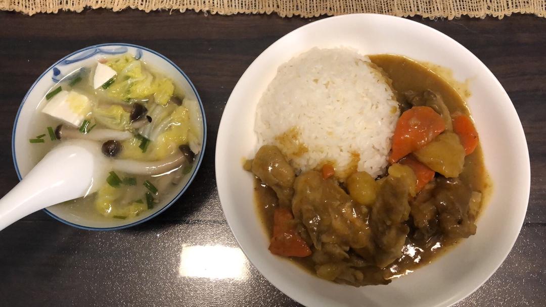 晚餐:咖喱鸡盖饭、豆腐娃娃菜蟹味菇汤