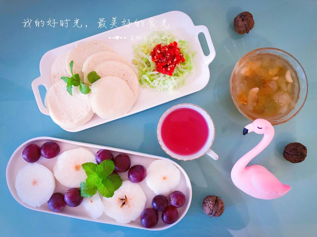 今日早餐:家作馒头+凉拌莲白+营养美学+桃胶银耳百合羹+雪梨+提子