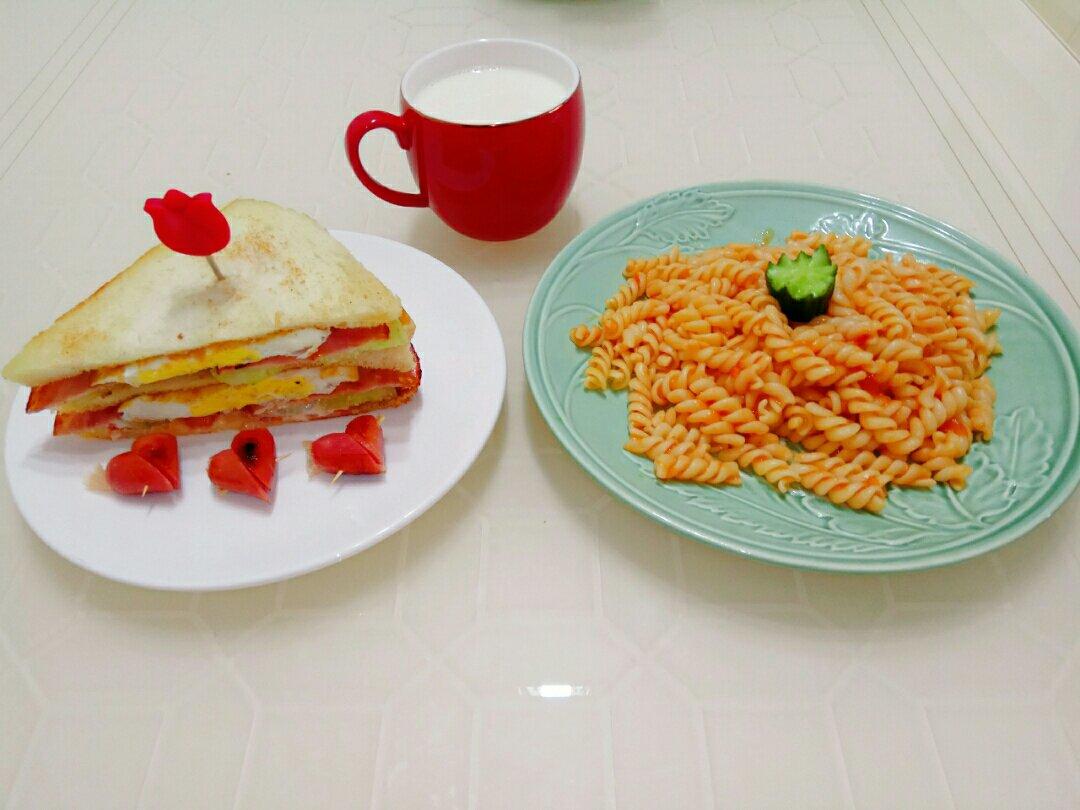 早餐,三明治,螺旋意大利面,牛奶。