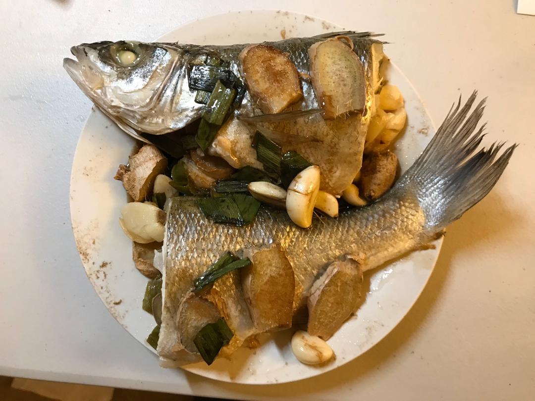盘子太小了放不下,只好先分尸了,哈哈。没有豆豉和蒸鱼豉油,就用了生抽,醋,海鲜酱,蠔油,葱和蒜调的酱汁。味道很好,不过还是归功于新鲜的鱼😎。