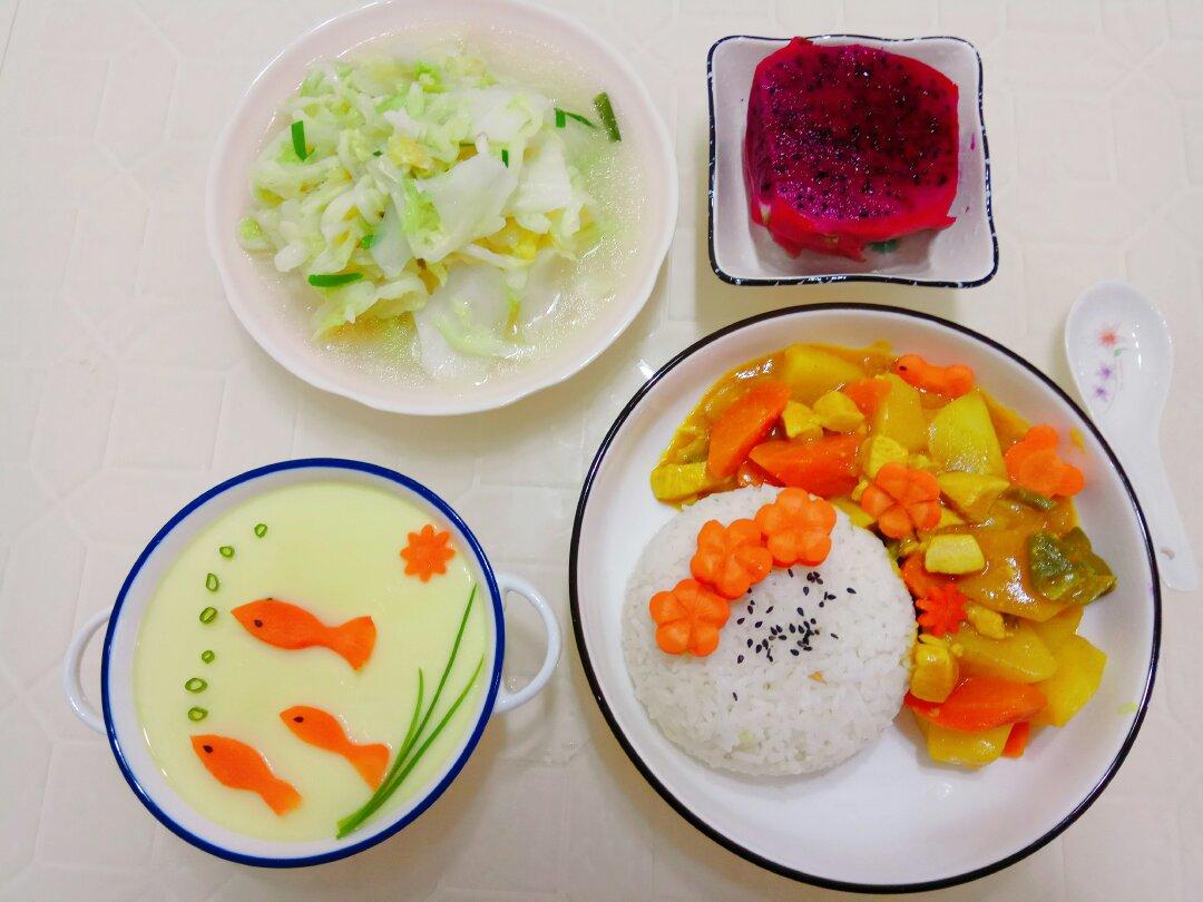 木叶潇潇下 做过 每日早餐更新 昨晚我女儿做英语课件,我问感觉怎么样,她说最喜欢现在的英语课了,辅导机构的中教外教老师都很负责,孩子对英语也越来越感兴趣。早餐,咖喱鸡肉土豆,清炒白菜,蒸蛋(用刀子划了几个鱼,给孩子一个小惊喜,她说舍不得吃了),红心火龙果,米饭。 2019-11-14