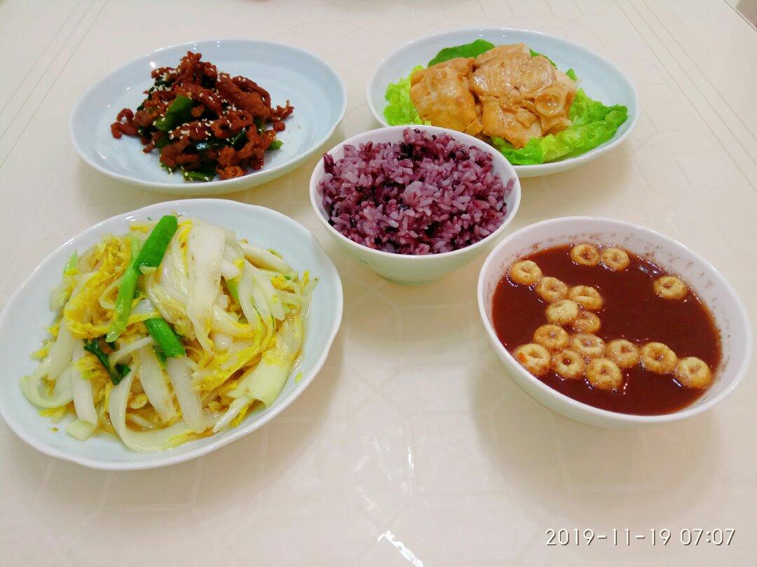 早餐,青椒牛肉,清炒娃娃菜,鱼,红豆汤,黑米饭。