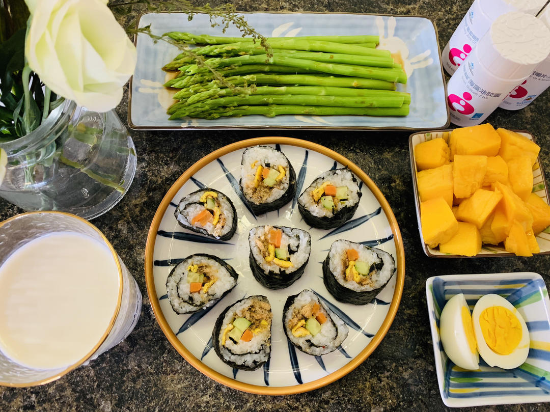 许丹丘 做过 2019年06月11日 【一起做早餐】寿司+芦笋+水煮蛋+芒果+牛奶+多维锌海藻油什么是生活,一菜一蔬,一碗一碟,盛开的鲜花,新鲜的水果……他们中间藏着美好的烟火气🌾🦋🌸 2019-06-11