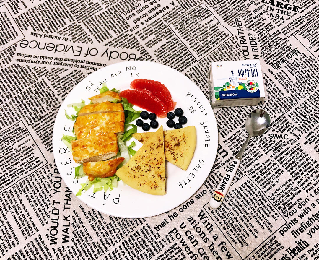 花样早餐—煎奥尔良鸡肉➕新疆烤馕➕牛奶➕蓝莓、西柚☀️💪😃