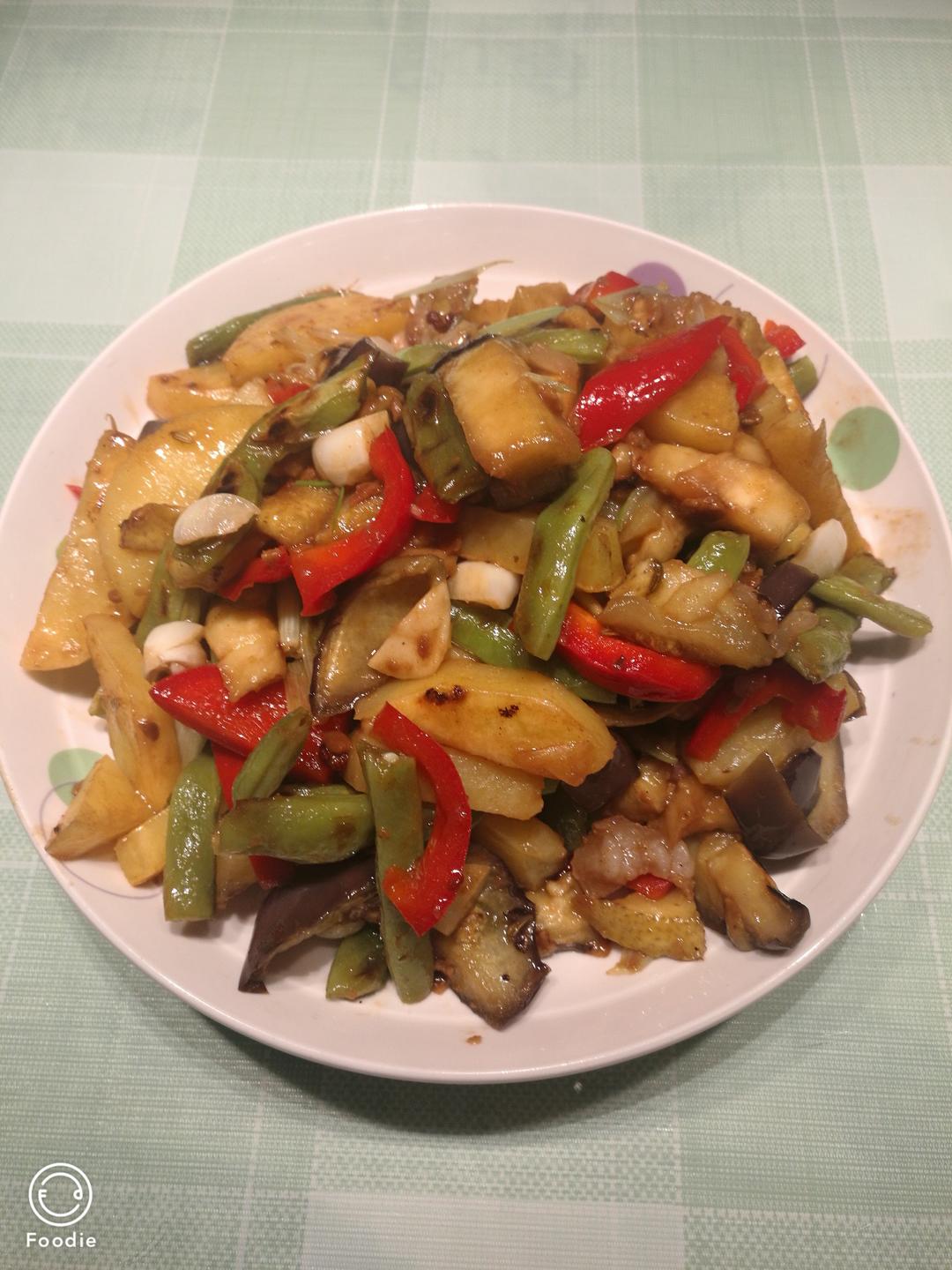 三叶草hh 做过 晚餐•2019年6月21日 晚餐简单,一个菜,一碗粥,哈哈...少有版地三鲜,土豆茄子豆角都用电饼铛不加油炕熟,先放少许五花肉炒香,再放入已炕熟茄子土豆豆角后加豆瓣酱,蒜可以多放点,味更香! #晚餐•2019年6月21日# 2019-06-21