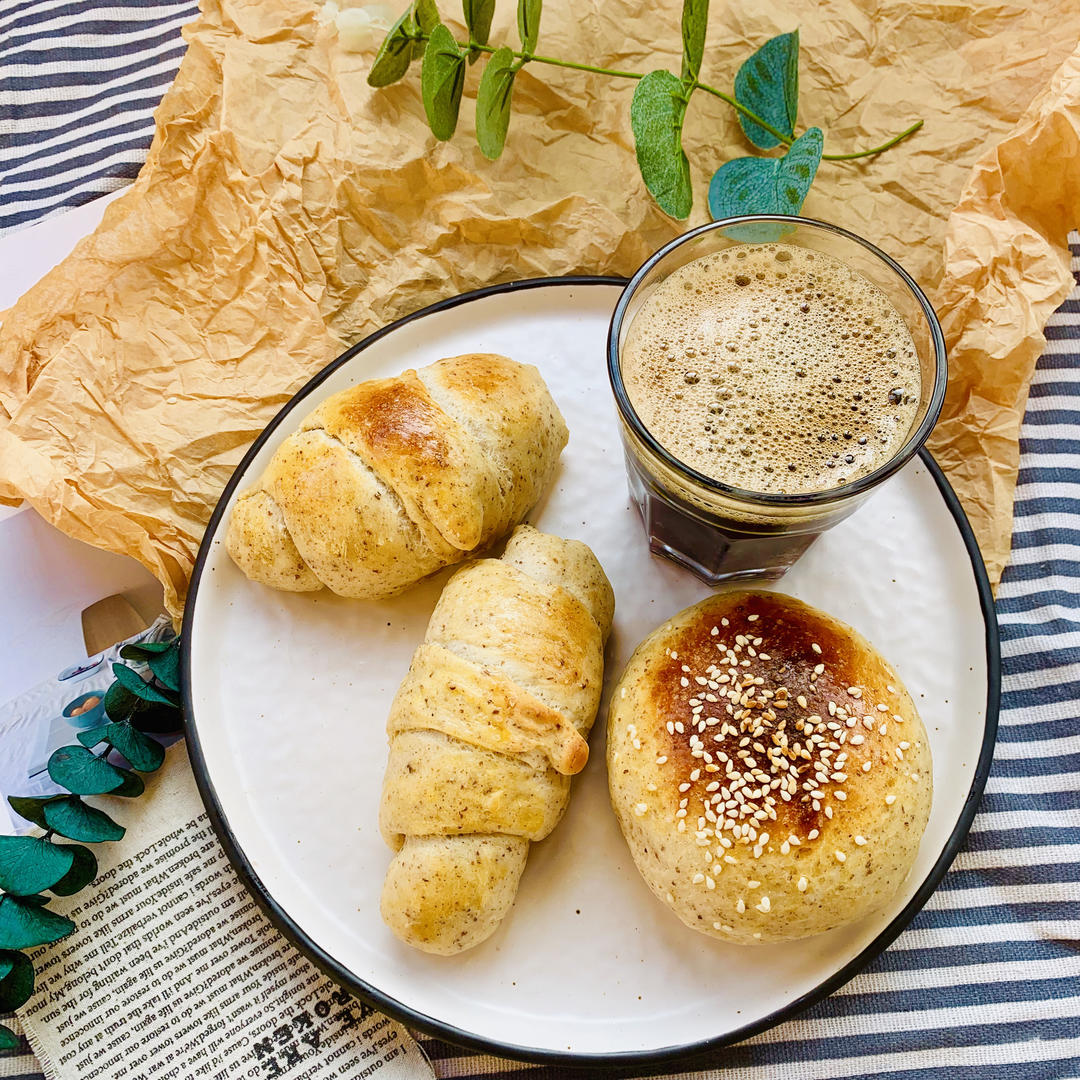 自制海盐牛角面包和芝士奶酪面包搭配美式咖啡👍🏻