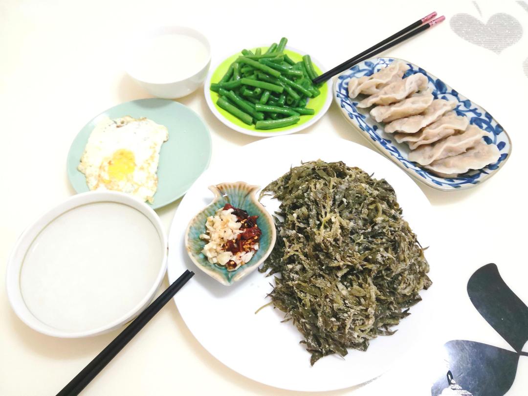 早晨好……蒸扫帚菜,烫豇豆,大米粥