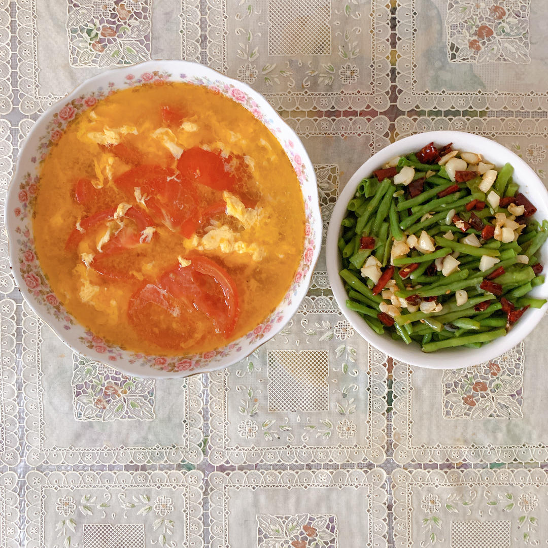 今天午餐:西红柿鸡蛋汤+凉拌缸豆。😃