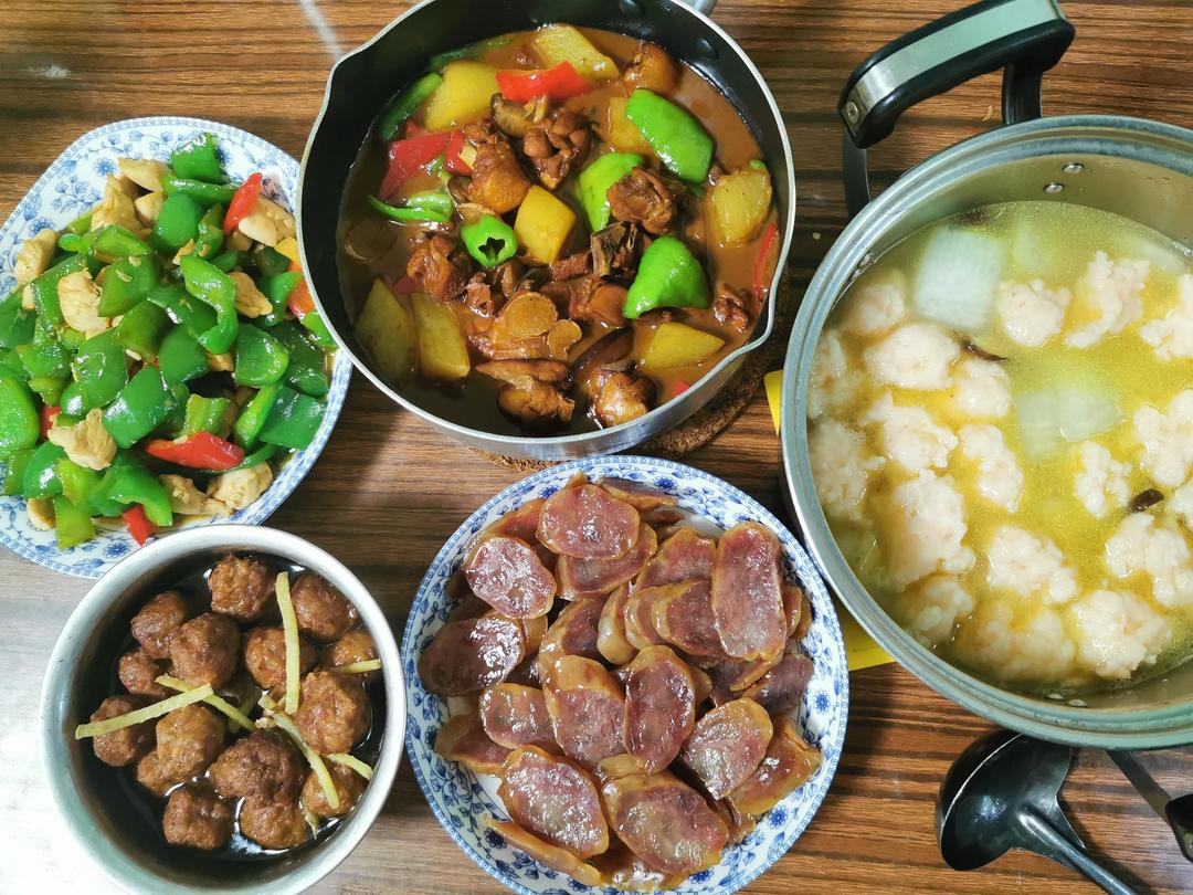 午餐!黄焖鸡,辣子鸡丁,蒸丸子,蒸香肠,虾滑冬瓜汤