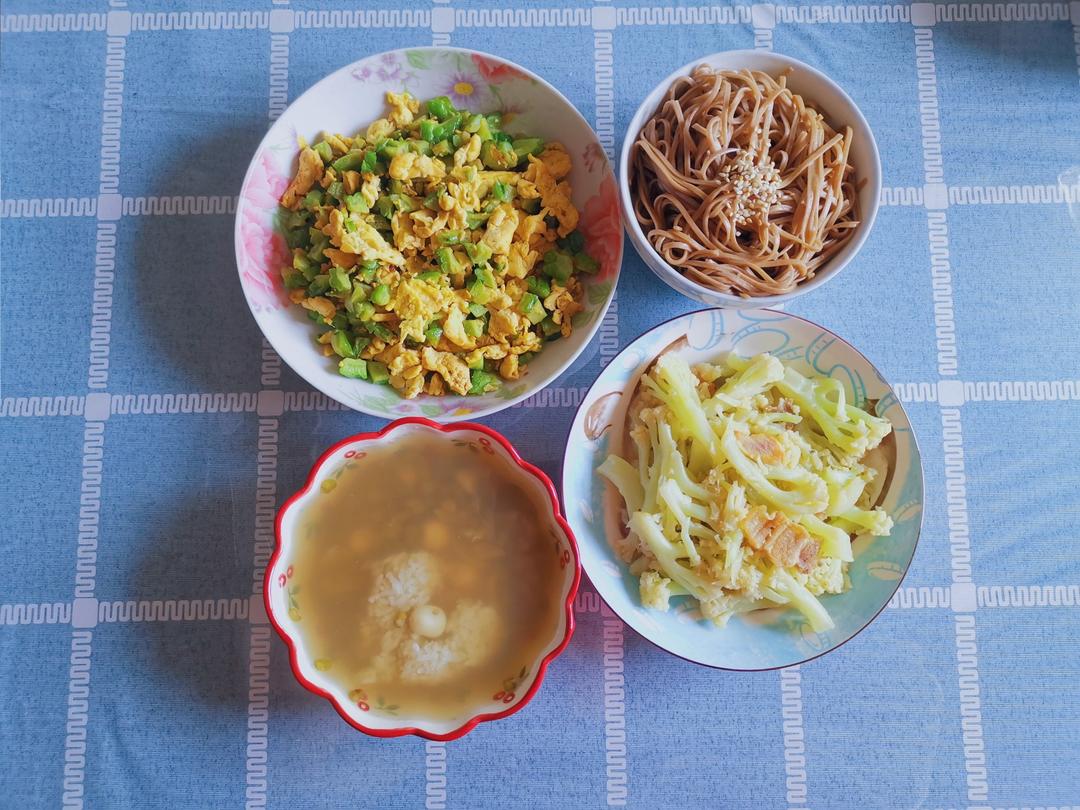 dream麒麟 做过 2019年07月31日 天气好热,来碗绿豆汤来个苦瓜败败火降降暑吧!苦瓜炒蛋以后苦味就好很多了,我本身是吃不进苦瓜的人,但苦瓜炒蛋我就很爱。 给奶奶煮的黑麦荞麦面,黑麦含量很高,很健康。 绿豆莲子百合糯米汤,随便挖的冰糯米竟然还是爱心型,无巧不成书,很可爱。 和奶奶一起,很满足又清淡的一餐。20190731 2019-07-31