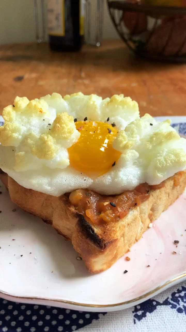木的米大人 做过 早餐•2019年8月23日 一份变体的番茄炒蛋OwO一切自制~吐司烤好后抹了一层用rosemary,盐和黑胡椒调味的番茄浓酱,放上云朵蛋很喜欢蛋白打发后的口感还有切开蛋黄流心的感觉XD 另外番茄和蛋真的是绝配啊,任何蛋腥味都在浓郁的番茄味下消失不见了~ #早餐•2019年8月23日# 2019-08-23