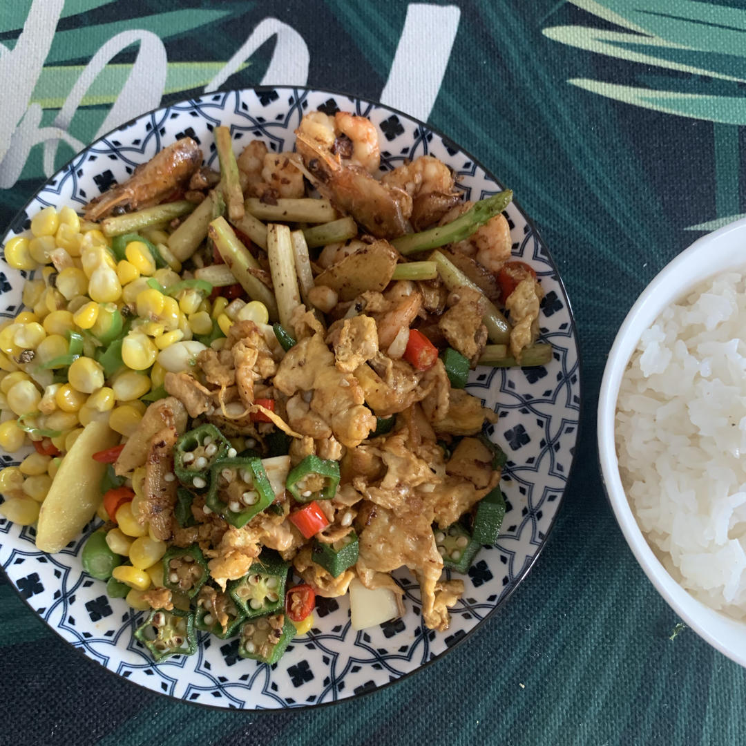 清炒玉米🌽芦笋炒鲜虾仁🍤秋葵炒鸡蛋🥚