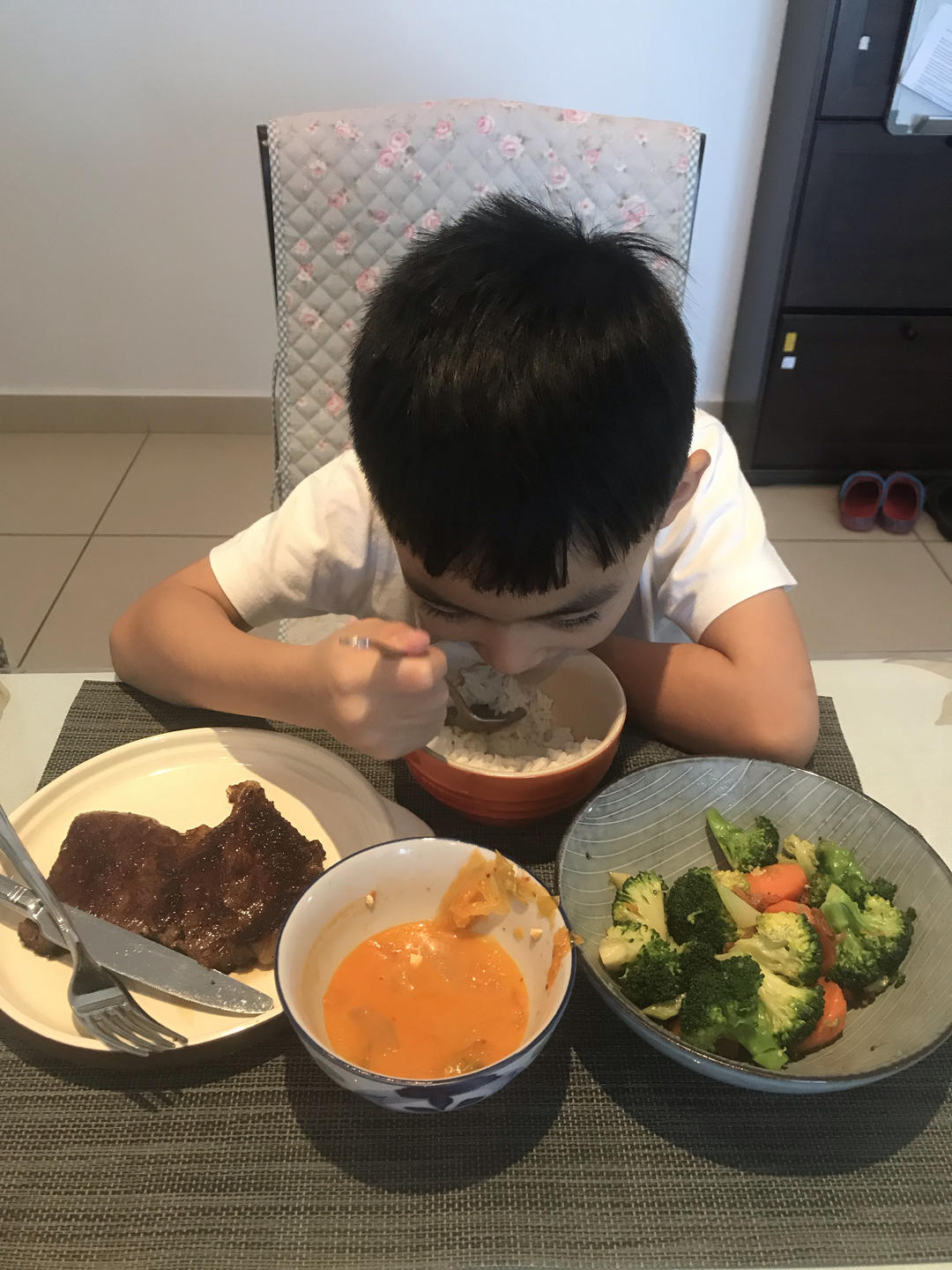 放学回来开吃:水煮西兰花胡萝卜、米饭、牛肉、泡菜豆腐汤(菜没上齐就被娃吃完了)。