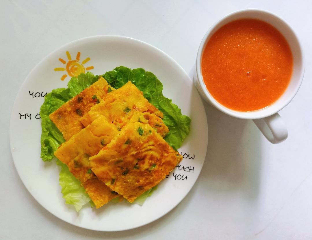 早安,胡萝卜🥕西红柿汁+胡萝卜葱花鸡蛋饼😘