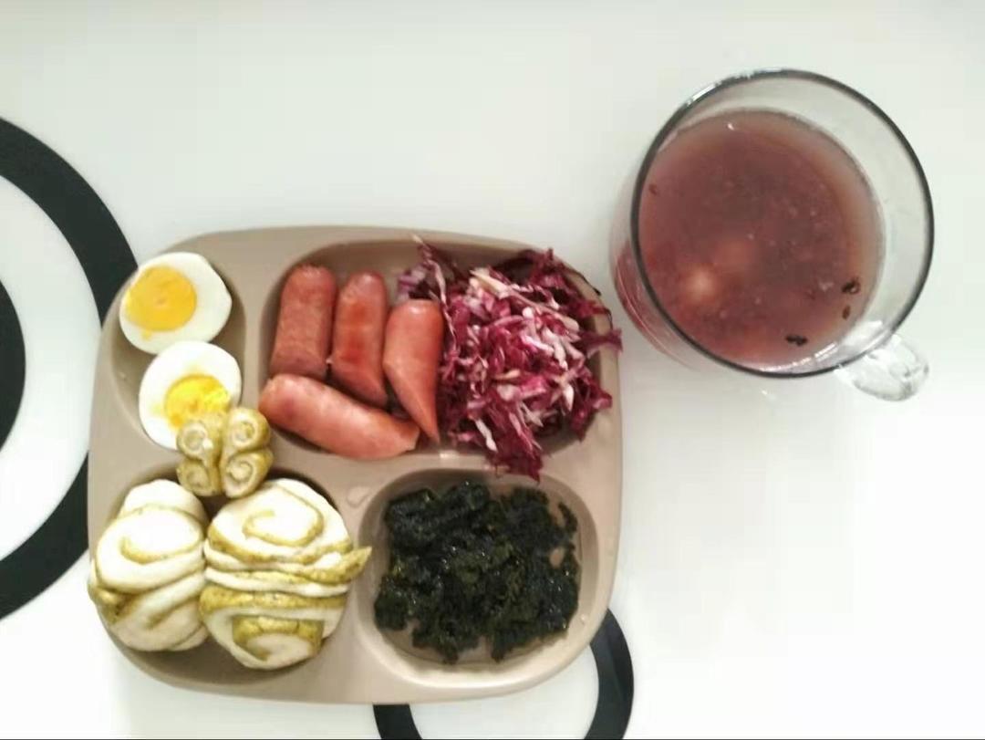 双色花卷+烤肠+芒果醋生菜沙拉+凉拌海葡萄+水煮蛋+酒酿圆子