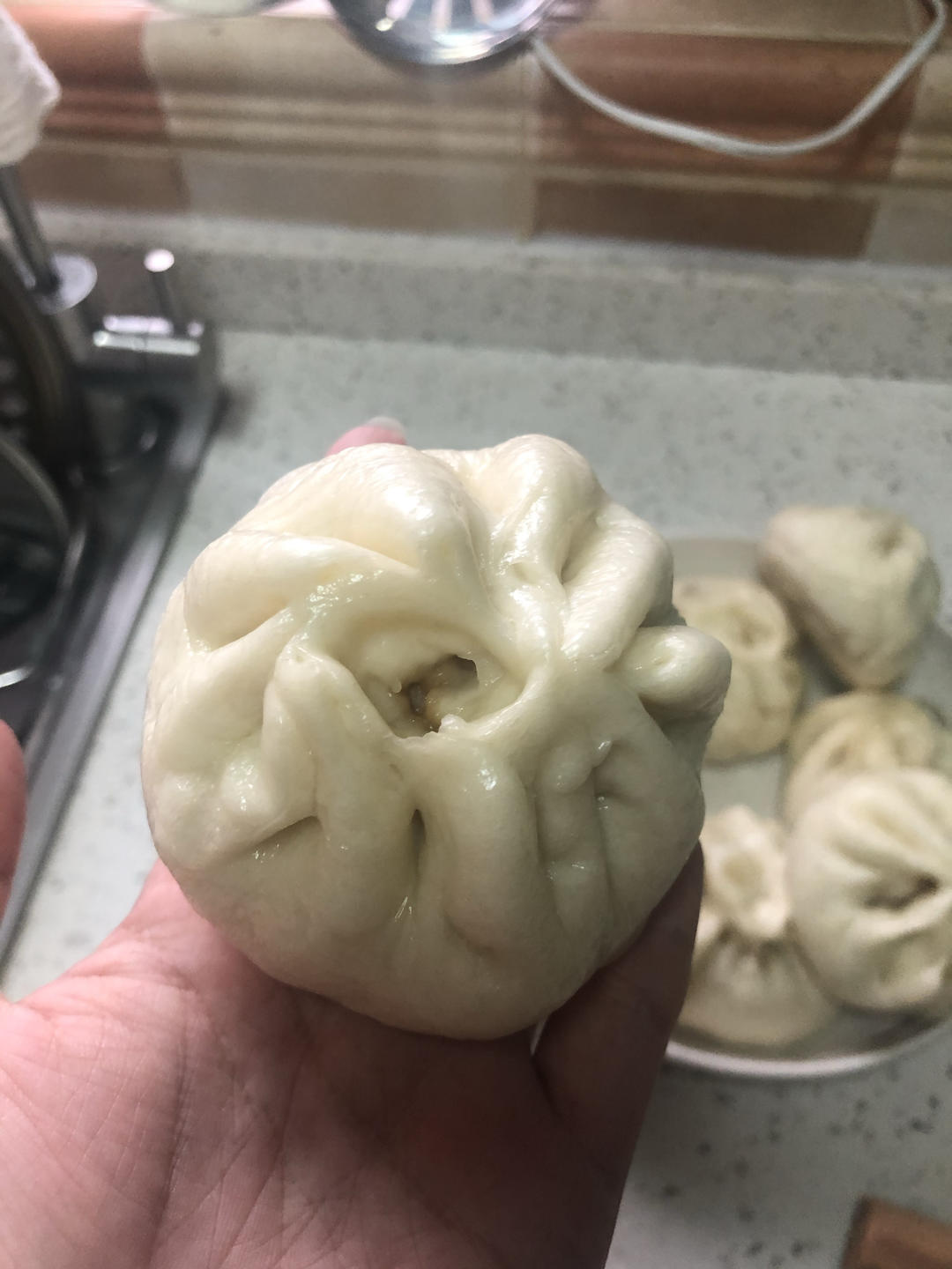 肉馅是老爸调的,加了鲜汁酱油,两个鸡蛋,手打上浆。味道有点接近店里卖的
