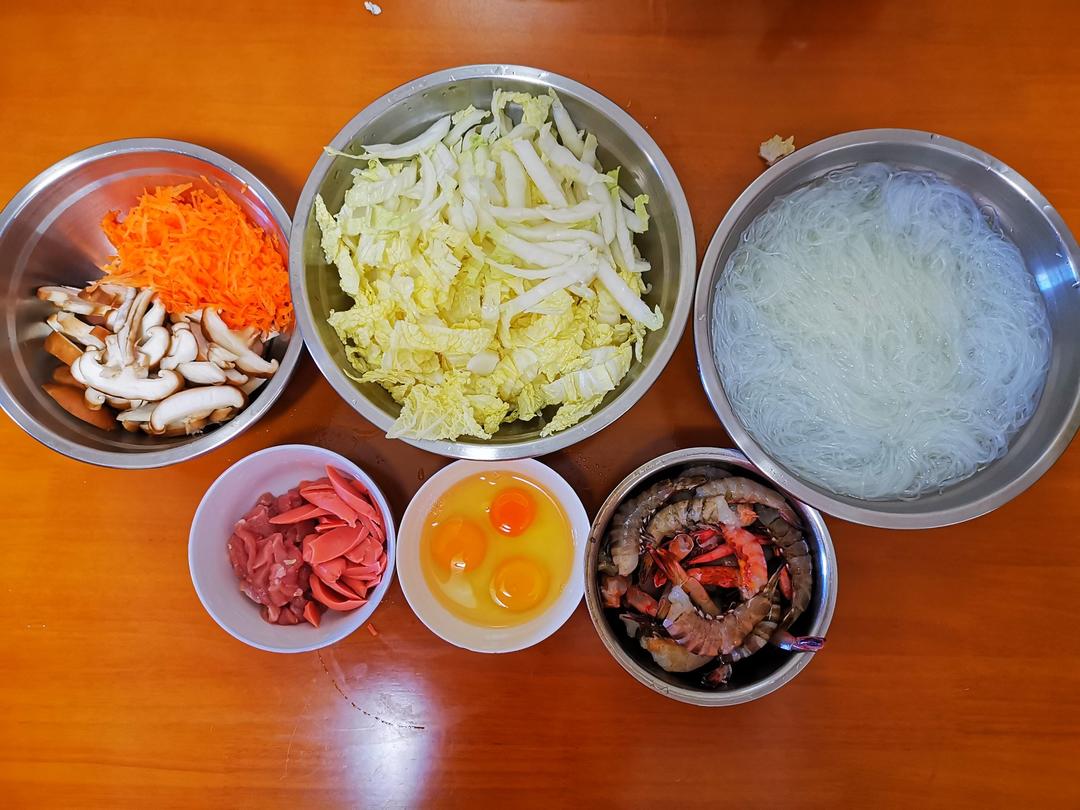 准备好白菜,胡萝卜丝,蘑菇,海虾,鸡蛋,瘦肉,火腿肠,粉丝