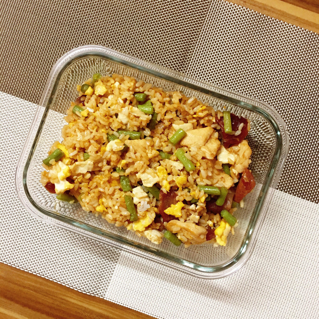 Rainbow_云宝儿 做过 午餐•2019年10月24日 2019.10.24 昨晚吃剩了一些叉烧,早上就着鸡蛋、豆角和隔夜饭炒一起,工作日带饭的午餐简单搞定。🍲 #午餐•2019年10月24日# 2019-10-24