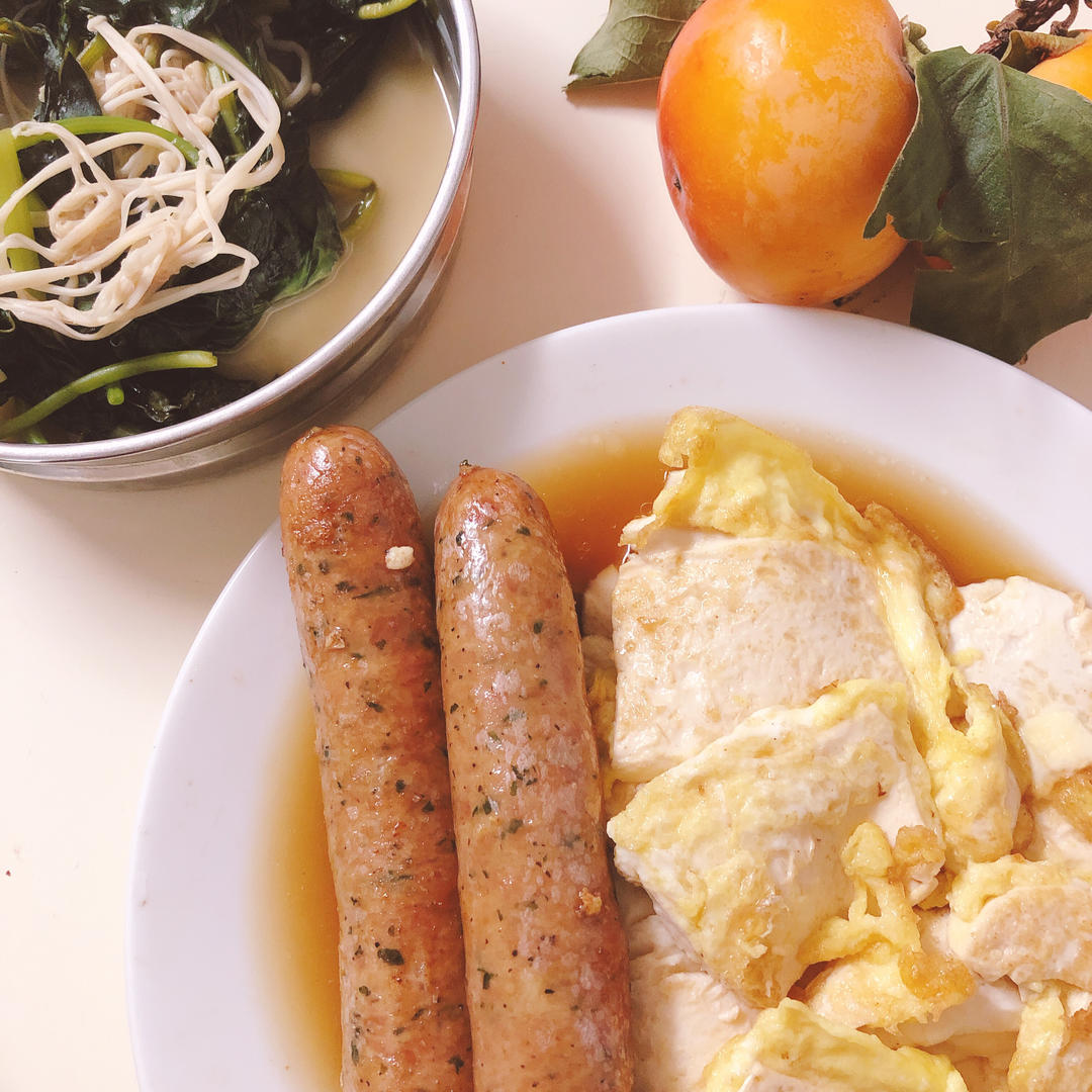 今日午餐:豆腐煎蛋,香肠,豆浆,地瓜叶➕金针菇