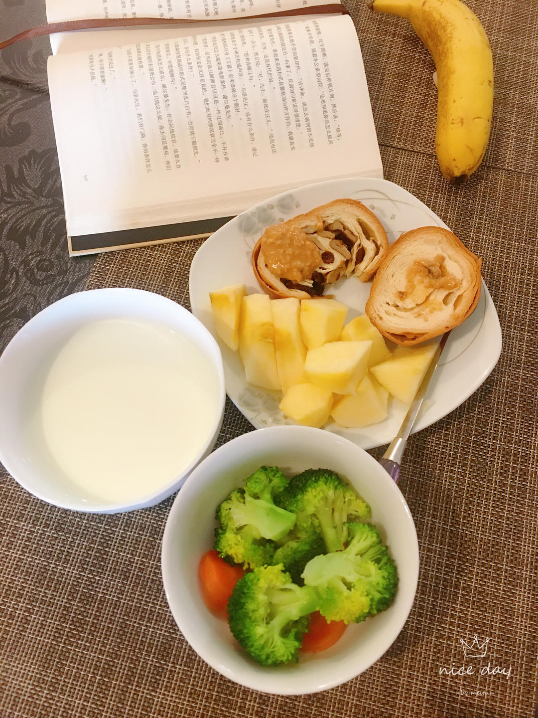 落素 做过 早餐•2019年11月19日 列巴,二匙花生酱,热量高,好吃😋苹果蘸花生酱,绝西兰花胡萝卜,放的椰子油,香香的牛奶,列巴泡入,又是一吃法食物使得心情愉悦,😊 #早餐•2019年11月19日# 2019-11-19