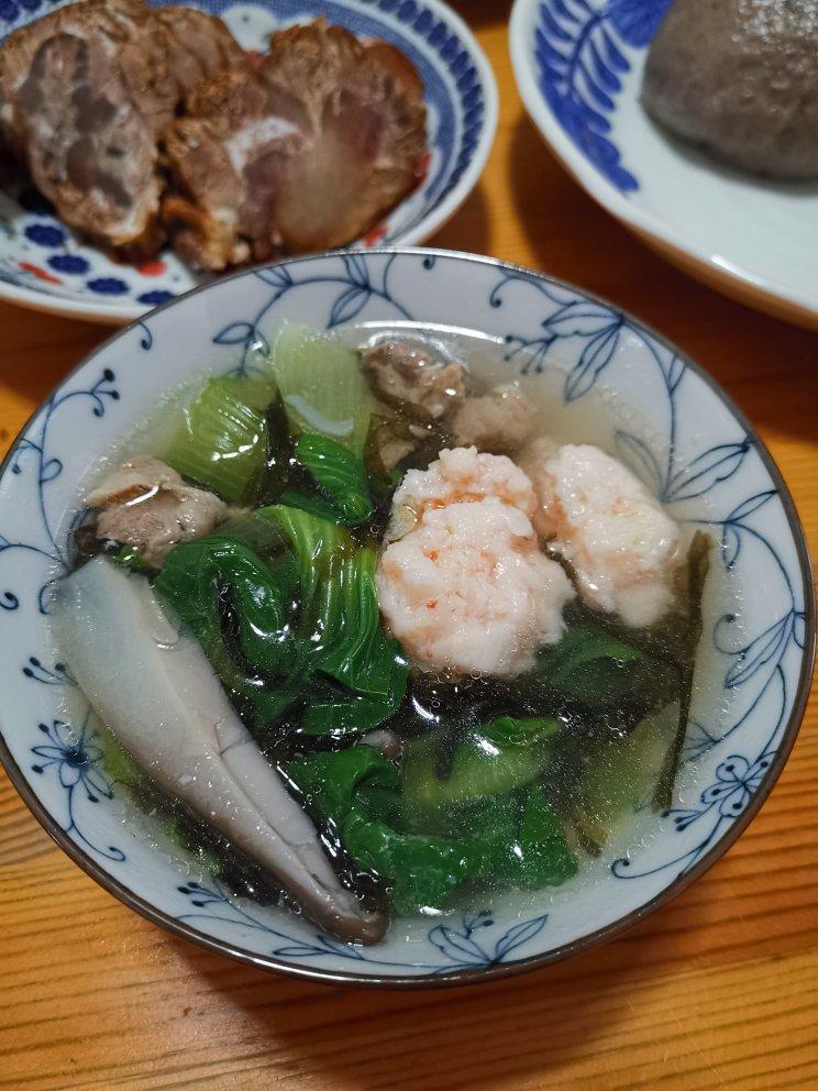 虾丸汤,牛腱子,炝拌干豆腐,蒸蛋羹,馒头。