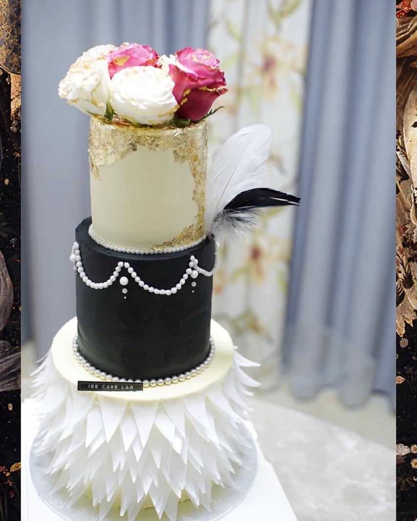 被耽误的歌手 做过 口感酷似戚风的海绵蛋糕 轻奢复古风最底下用糯米纸做成的羽毛形状裙摆,一片一片粘了好久,出来效果好喜欢。中层搭配自带复古风的糖珠围边,当然少不了金箔的奢侈点缀~还有,三层是真的沉。海绵蛋糕🧽动物淡奶油🐄水果🥭奶酪芝士🐄动物黄油🐄要好吃也要好看。🎁 2019-11-27