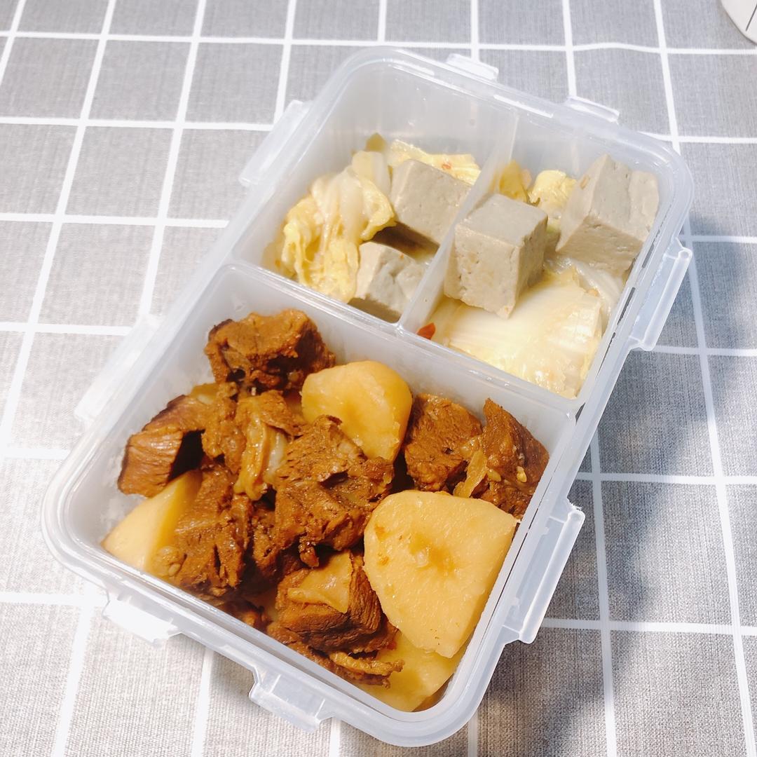 一只油鸡 做过 番茄土豆炖牛腩 将牛肉焯水之后撇去浮末,牛肉放进电饭煲,倒热水放香料。先炖了1小时,放入大块土豆后再炖1小时,放盐。比起砂锅用电饭煲非常省心,不用看着火,炖完也能自动保温。一顿饭吃了一半,留一半用密封袋包好放冷冻层,过几天煮面条可以直接用(⁎⁍̴̛ᴗ⁍̴̛⁎)#便当# #一人食# 2019-12-03