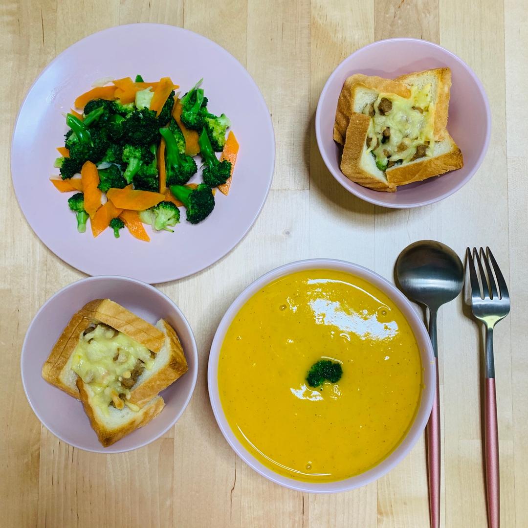 吐司披萨盏🍕奶油南瓜汤🥣蒜香西兰花🥦