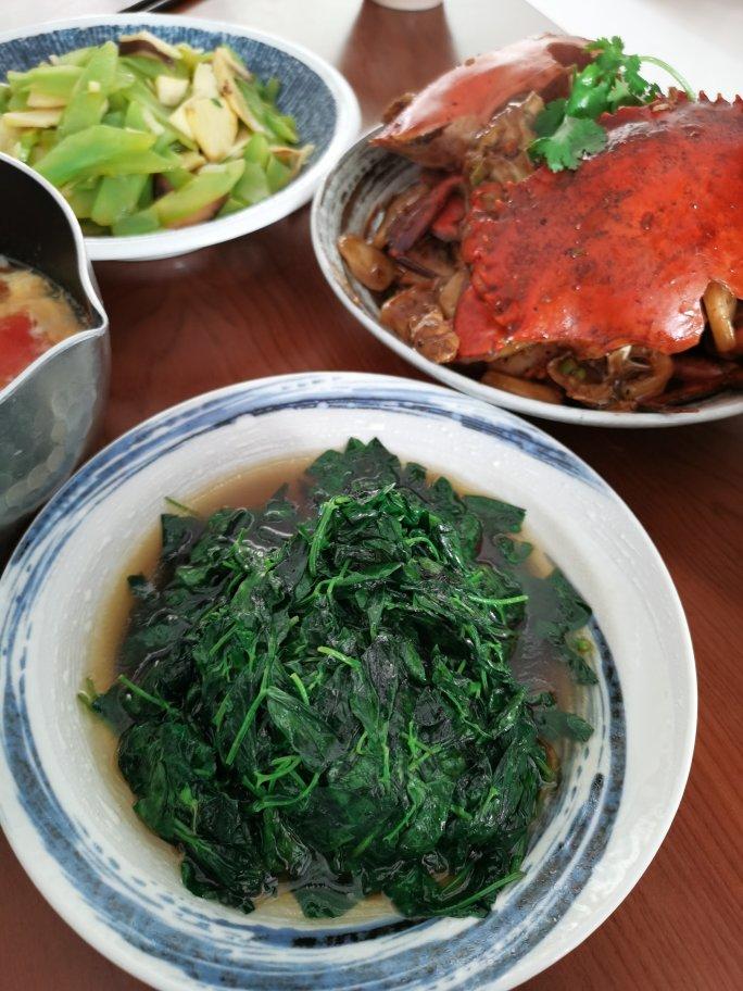 酒香草头,黑胡椒膏蟹年糕,炒双笋(莴笋冬笋 ),番茄汤